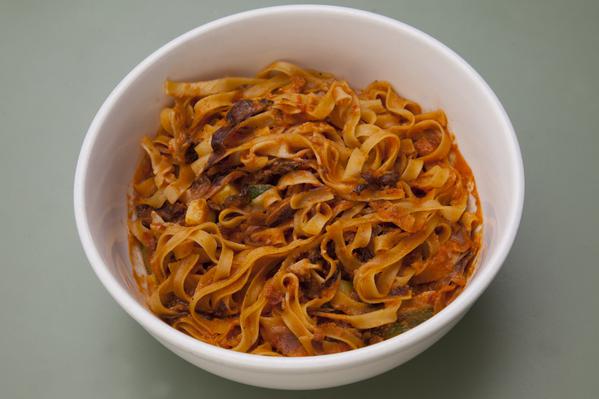 Fettucini with roasted zucchini & radicchio in a tomato/bechamel sauce.